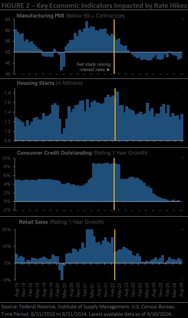 Figure 2 graphs four economic indicators that offer insight into the current state of the U.S. economy: manufacturing PMI, housing starts, consumer credit, and retail sales. To show the impact of interest rate hikes, the start of the Fed’s tightening cycle in March 2022 is marked on each chart.