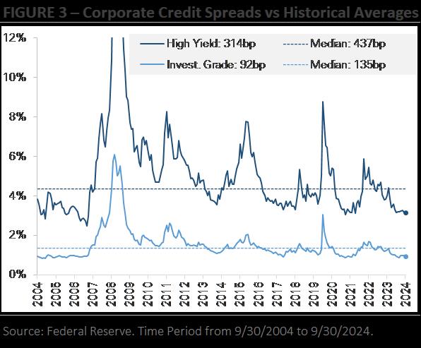 Credit spreads, which measure the difference in yield between two bonds of similar maturity but different credit quality, remain tight by historical standards. Figure 3 graphs the credit spreads for corporate investment grade (IG) and high yield (HY) bonds over the past 20 years. The IG spread stands at 0.92%, meaning that investors are earning an extra +0.92% of yield by owning IG over similar Treasury bonds. Since 2004, the median IG spread has been 1.35%. The situation is similar for HY bonds, where the current spread is 3.14% compared to a median of 4.37%.