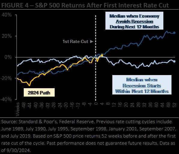 The next chart demonstrates why the economy’s direction is important. Figure 4 tracks the S&P 500’s performance in the 12 months before and after the first interest rate cut. It features two paths. The dark blue line represents the S&P 500’s median return path when the economy avoids a recession in the 12 months following the first rate cut. The light blue line represents the S&P 500’s median return path when the economy enters a recession within 12 months after the first rate cut. For comparison, the two lines are indexed to 100 the week of the Fed’s first interest rate cut.