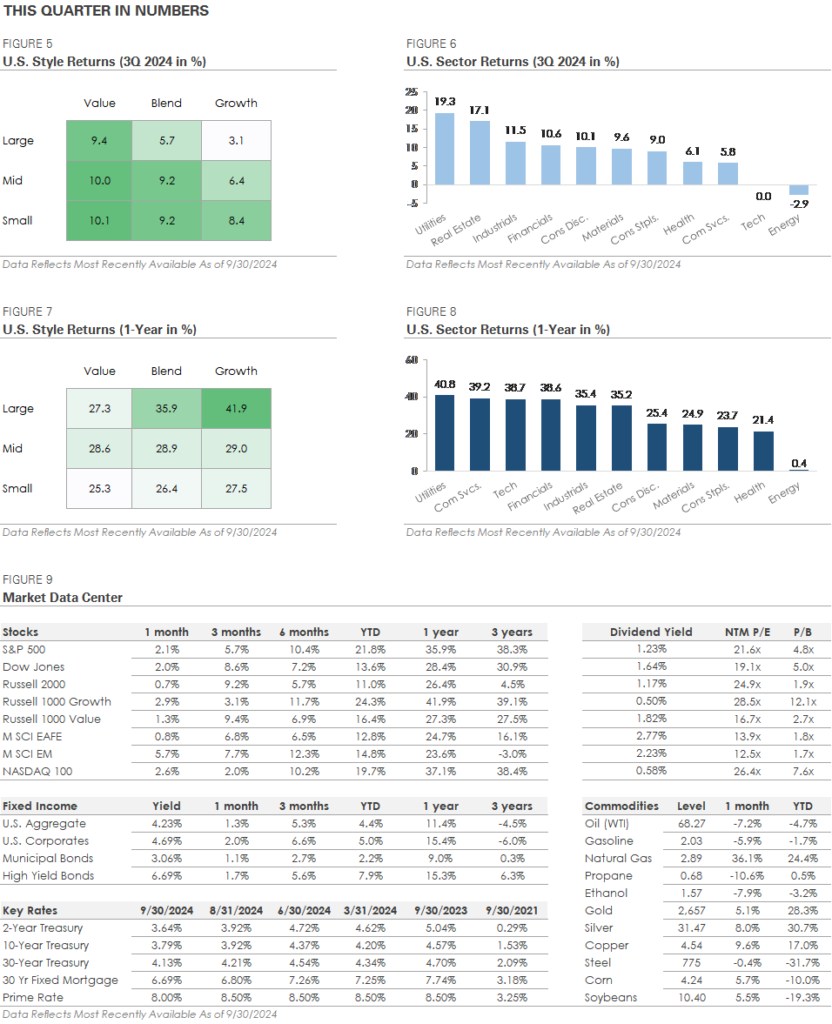 Despite the volatility, the S&P 500 set multiple new all-time highs in 3Q24, adding to its list of new highs from earlier in the year. However, it was the change in stock market leadership that made headlines. The Equal-Weighted S&P 500, the Russell 2000, and the Value factor all outperformed the S&P 500, while the Growth factor underperformed. A similar pattern occurred at the sector level, with underperformers from the first half of 2024 outperforming in 3Q24. Interest-rate-sensitive sectors outperformed in anticipation of rate cuts, with the Utility and Real Estate sectors both gaining over +17%. Cyclical sectors, including Industrials, Financials, Consumer Discretionary, and Materials, also outperformed the S&P 500. In contrast, the Technology sector lagged the market rally, ending the quarter flat after outperforming in the first half of the year.