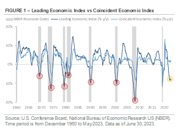 The chart shows the LEI declined -8% during the past 12 months, an indication the economy may be approaching a turning point as the Fed’s interest rate hikes take effect. In contrast, the CEI rose +2% over the same period, an indication the economy currently remains strong. What does the LEI/CEI divergence imply? Positive CEI doesn’t necessarily mean the economy has avoided a recession, but CEI’s rise does provide additional evidence showing the U.S. economy’s resilience despite higher interest rates. On a related note, the chart shows it’s not uncommon for the LEI to decline even as the CEI remains positive. The red circles highlight prior instances like today, where LEI declined first and then CEI declined later. However, the gray shades show the U.S. economy has been near the start of a recession each time the LEI fell by more than -5% in 12 months.