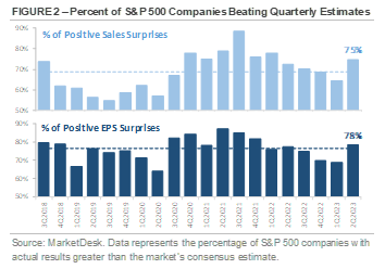 Corporate earnings tell a similar story to economic data. While the S&P 500’s earnings declined -2% year-over-year in the first quarter, an increasing number of companies reported results that exceeded analysts’ estimates. Figure 2 graphs the percentage of S&P 500 companies beating sales and earnings estimates during Q1 earnings season. The top chart shows 75% of companies beat their sales estimate in Q1, up from 65% the prior quarter and above the 5-year average of 69%. From an earnings perspective, 78% of companies beat their estimate, up from 69% the prior quarter and slightly above the 5-year average of 76%. Like the economy, investors appear to be underestimating corporate earnings strength.