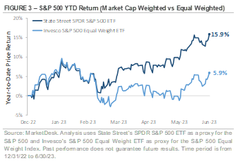 However, the market cap and equal weight versions of the S&P 500 diverged in March when the first signs of regional bank turmoil appeared. The S&P 500 traded higher in April and May, while the Equal Weight S&P 500 traded sideways. The split indicates the biggest stocks drove a large portion of the S&P 500’s gain in Q2. While the S&P 500 ended the first half of 2023 with a strong return, the average stock’s return was noticeably smaller and indicates the first half rally was top-heavy. Investors will be watching to see if the first half S&P 500 rally broadens in the second half of the year.