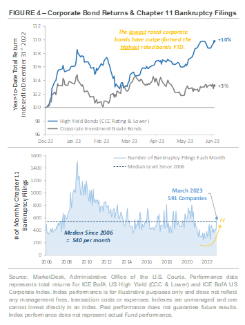 While rising interest rates caused bonds to trade lower, high yield corporate bonds traded higher in Q2 and produced a +0.7% total return. The top chart in Figure 4 takes the analysis a step further by comparing the return of CCC bonds, which are the lowest rated corporate bonds with a higher perceived risk of default, against a broad index of corporate investment grade bonds. The chart shows CCC-rated bonds generated a ~10% total return through June 30th, which includes both price appreciation and interest received. For comparison, investment grade bonds generated a ~3% total return over the same period. Why are the riskiest corporate bonds outperforming? They offer a higher yield as compensation for taking on more credit risk. An index of corporate investment grade bonds yielded 5.6% on June 30th, while an index of CCC bonds yielded 14.0%, almost 2.5x higher. The higher yield translates into more interest income, helping to boost total return.