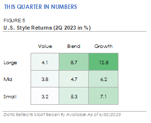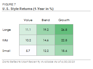 Treasury yields rose sharply in Q2 after ending Q1 lower due to regional bank stress. The 2-year Treasury yield, which is viewed as a proxy for Federal Reserve policy rate, rose from 4.06% to 4.87%. Over the same period, the 10-year Treasury yield rose from 3.49% to 3.81%. The increases are being attributed to better-than-expected economic data, which could in turn force the Fed to raise interest rates higher than previously thought. Rising interest rates weighed on bonds in Q2 with the Bloomberg U.S. Bond Aggregate, an index that tracks a wide array of Treasury, corporate, and other investment grade bonds, producing a -0.9% total return.