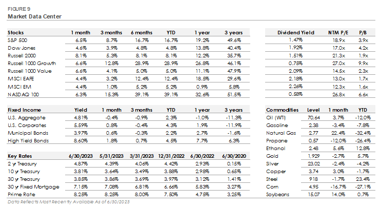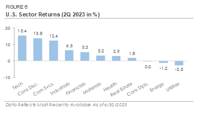 Equity markets are off to a strong start this year. After a steep sell-off in the first half of 2022, the S&P 500 returned +16.7% in the first half of 2023. The year-to-date gain ranks as the fifth strongest first half return since 1989. The biggest Technology stocks performed even better, with the Nasdaq 100 returning +15.3% in Q2 after its +20.7% Q1 return. The Nasdaq 100’s +39.1% return is the strongest first half year return since 1989, ranking ahead of both 1998 and 1999 during the dot-com bubble. Small cap stocks also participated in the rally, returning +8.1% through the end of June. The year-to-date equity market gains have lifted portfolios after a difficult 2022.