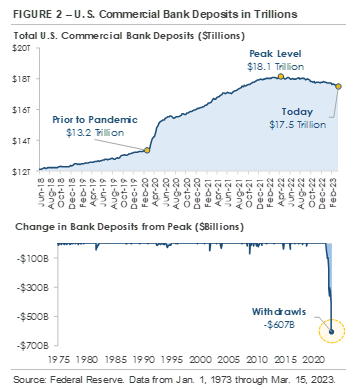 Three regional banks failed in March as the banking industry faced a crisis of confidence and customers quickly withdrew deposits. The top chart in Figure 2 (next page) shows deposits at U.S. commercial banks rose from $13.2 trillion at the end of 2019 to a peak of $18.1 trillion in April 2022 as businesses and individuals flooded banks with new deposits during the pandemic. More recently, deposits at commercial banks decreased in 9 of the last 12 months. The bottom chart in Figure 2, which graphs the change in bank deposits from peak levels, shows total U.S. commercial bank deposits have declined -$607 billion since April 2022. The decline marks the biggest banking sector deposit outflow on record and is starting to stress bank balance sheets.