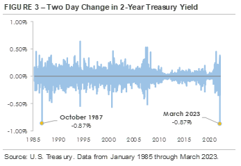 Figure 3, which graphs the rolling 2-day percentage change in the 2-year U.S. Treasury yield, shows the recent spike in volatility. Taller bars indicate the 2-year Treasury yield experienced a bigger 2-day move. The chart looks like a heartbeat over the past 12 months, going up and down with occasional volatility as markets responded to new information. However, the far right of the chart shows a spike in both directions recently. The 2-year yield plunged -0.87% on March 13th after two regional banks failed over the weekend, its biggest 2-day decline since the Black Monday stock market crash in October 1987. After banking regulators took over control of the banks and the Federal Reserve introduced lending programs to stabilize the banking sector, the 2-year yield surged +0.35% on March 21st.