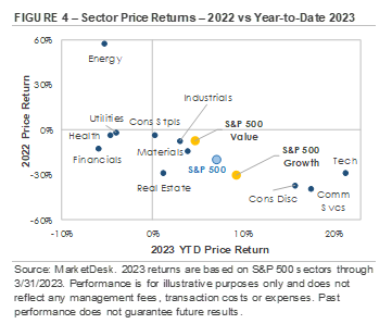 The Growth vs Value performance reversal also shows up in first quarter sector returns, with Growth-style sectors outperforming. Figure 4 is a scatterplot that compares each sector’s 2022 return (vertical y-axis) against its first quarter 2023 return (horizontal x-axis). In general, the worst performing sectors in 2022 are the top performing sectors in 2023, while 2022’s top performing sectors are broadly underperforming to start 2023. Beyond the year-to-date performance reversal, there was no obvious preference for defensive or cyclical sectors.
