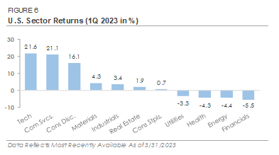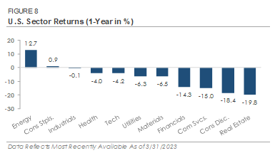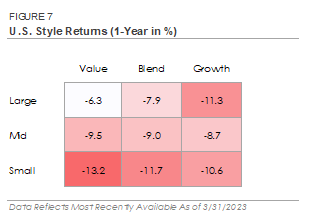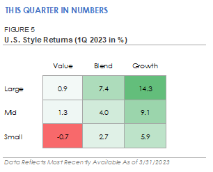 Stocks traded higher in January before giving up some of their gains in February and March. The S&P 500 Index of large cap stocks ended the first quarter up +7.4%, outperforming the Russell 2000 Index’s +2.7% return. Most of the S&P 500’s relative outperformance occurred in March as investors de-risked their portfolios following the bank failures. There was also a sizable shift in factor performance during the first quarter. The Russell 1000 Growth Index gained +14.3%, outperforming Russell 1000 Value’s +0.9% return. Like the S&P 500, the Growth factor’s relative outperformance occurred in March after the bank failures. Growth stocks tend to be higher quality businesses with stronger fundamentals, and recent bank failures may have motivated investors to rotate into higher quality companies. Regardless of the cause, Growth’s outperformance is a significant change from 2022 when the Federal Reserve’s interest rate increases weighed on expensive stock valuations.
