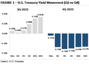 Following a significant increase in Q3, Treasury yields moved sharply lower in Q4. Figure 1, which compares the change in yields during the two quarters, graphs the opposing interest rate moves. The gray bars show yields increased in Q3, with longer maturity yields rising the most. In contrast, the navy bars show yields reversed sharply in Q4, erasing nearly all their Q3 rise. The abrupt reversal can be attributed to a significant change in the market’s view heading into 2024.
