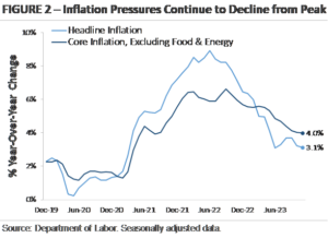 Data shows that inflation pressures continue to ease. Figure 2 graphs the year-over-year change in headline and core inflation. Headline inflation, which peaked at 9.1% in June 2022, dropped to 3.1% in November 2023. Likewise, core inflation, which excludes the volatile categories of food and energy, now stands at 4.0% after peaking at 6.6% in September 2022. The price declines have been widespread across categories, with price pressures easing across food, energy, airfares, and household furnishings and appliances.