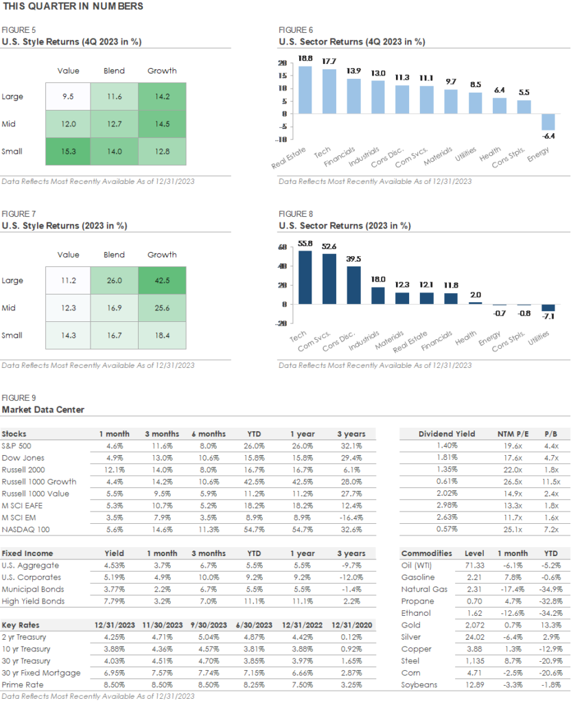 Jones, the NASDAQ 100, and the Russell 2000 each returned more than +11%. Real estate was the top-performing sector as falling interest rates relieved pressure on property owners, and cyclical sectors outperformed defensive sectors. In December, the Russell 2000 Index of small cap stocks outperformed the S&P 500 by +7.6%, its biggest month of outperformance since February 2000. The broad-based stock market rally demonstrates investors’ growing enthusiasm, with inflation falling, the economy surpassing expectations, and the Fed signaling the end of rate hikes.