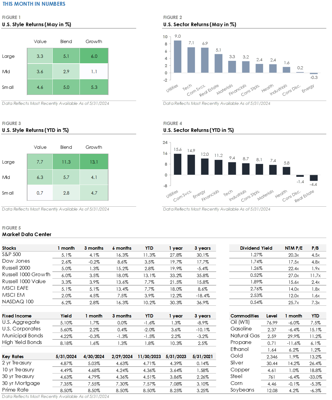 The S&P 500 set a new all-time high in May after trading lower in April. The technology-heavy Nasdaq 100 Index gained +6.2% and set a new all-time high, with mega-cap stocks like Nvidia, Apple, Microsoft, and Facebook-parent Meta leading the recovery. Notably, smaller companies also participated in the rally, with the Russell 2000 Index now showing positive YTD returns. In the credit market, Treasury yields reversed a portion of their April rise. The U.S. Bond Aggregate Index, which tracks a wide range of investment grade bonds, gained +1.7% as yields fell. What caused stocks and bonds to rebound after the April sell-off? The answer: Labor market and inflation data.