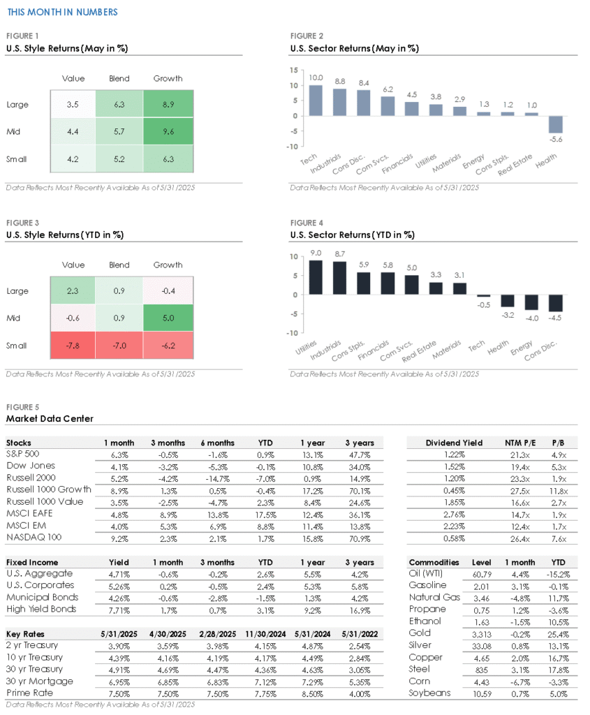 The defining story of 2025 has been changing trade policy. Markets have weathered two months of policy-driven volatility, only to end up roughly where they started. After a nearly 20% decline from late February to early April, the S&P 500 has rebounded and is within 4% of its all-time high. What remains is weakened business and consumer confidence, rising inflation expectations, and a Federal Reserve that has paused interest rate cuts. The threat of a full-scale trade war and global supply chain disruption has diminished, but the full impact of recent events may take months to become known. Early economic data suggests the tariffs have had a limited impact, but we will continue monitoring what happens to economic and earnings growth in the coming quarters.