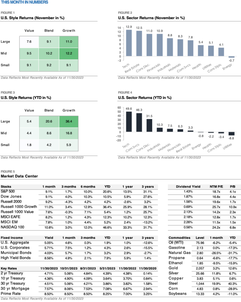 The big story during November was the decline in Treasury yields. The bond market experienced large moves in interest rates, with the 10-year Treasury yield falling to 4.36% from over 5% in October. For context, the -0.54% decline in the 10-year yield ranks among the biggest 1-month drops since December 2008, when the Federal Reserve cut interest rates by -0.75%. Falling Treasury yields provided relief to bonds, which have traded lower as the Federal Reserve hikes rates. The Bloomberg U.S. Bond Aggregate Index, which tracks a broad index of U.S. bonds, produced a +4.6% total return. It was the index’s first gain in seven months and its biggest gain since 1985.