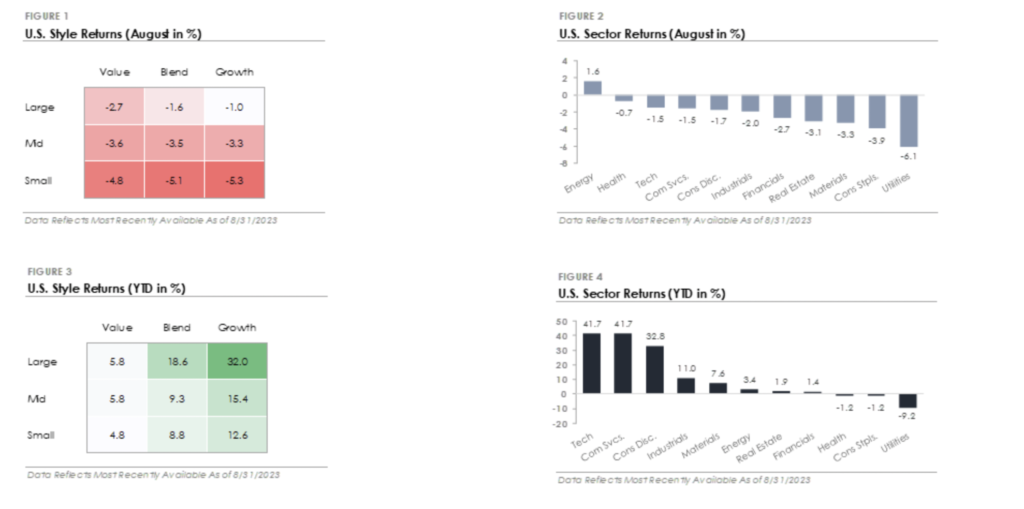 The S&P 500 traded lower during the first half of August, at one point erasing all of July’s 3.3% gain. The sell-off occurred as investors worried about the potential for further interest rate hikes and increased bond issuance by the Treasury to fund government spending. Interest rates rose to levels last seen in 2007, with the 10-year Treasury yield climbing to 4.35%. This sudden rise in interest rates caught the market by surprise and weighed on stock market valuations. However, interest rates reversed a portion of their rise later in the month, with the 10-year Treasury retreating to 4.09%. The S&P 500 found its footing as yields declined and recovered to finish the month with a -1.6% decline, its first monthly loss since February of this year.