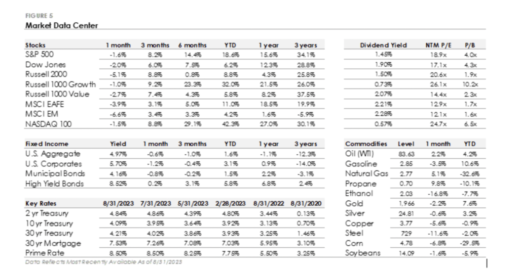 The August market action is a continuation of the primary trend we have seen this year. The market remains fixated on the Fed’s next move, including how high the Fed will raise interest rates and whether it will cut interest rates in 2024. Those decisions will significantly impact the economy and stock market, and investors want to position their portfolios correctly. Each economic data point and Fed speech are analyzed for clues about interest rate policy, and as we saw in August, stocks and interest rates can change direction suddenly as new information becomes available. The market outlook has changed multiple times this year due to investors’ short-term focus on Fed policy, but this dynamic is poised to shift as the Fed concludes its rate hike cycle.