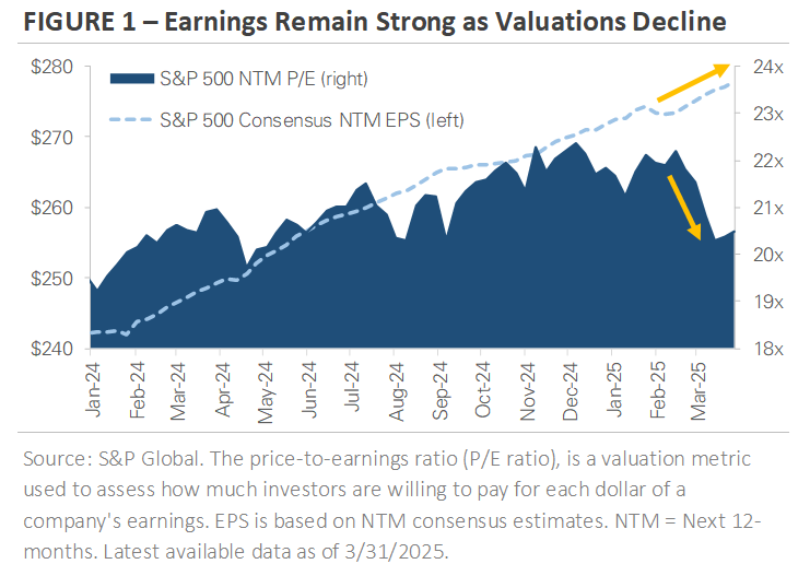 The big development in Q1 was falling stock market valuations, as rising policy uncertainty weighed on investor sentiment. Figure 1 provides context around the recent pullback, highlighting the divergence between earnings estimates and valuations. The dashed blue line graphs the rolling 12-month earnings forecast for the S&P 500, reflecting Wall Street analysts’ profit expectations for the year ahead. The navy shading graphs the S&P 500’s price-to-earnings (P/E) ratio, or how much investors are willing to pay for those future earnings. The chart shows earnings estimates tend to be less volatile than P/E ratios, which is natural as the market often swings between optimism and pessimism. The shift in sentiment during Q1, from optimism to caution, caused valuations to decline and stocks to fall.