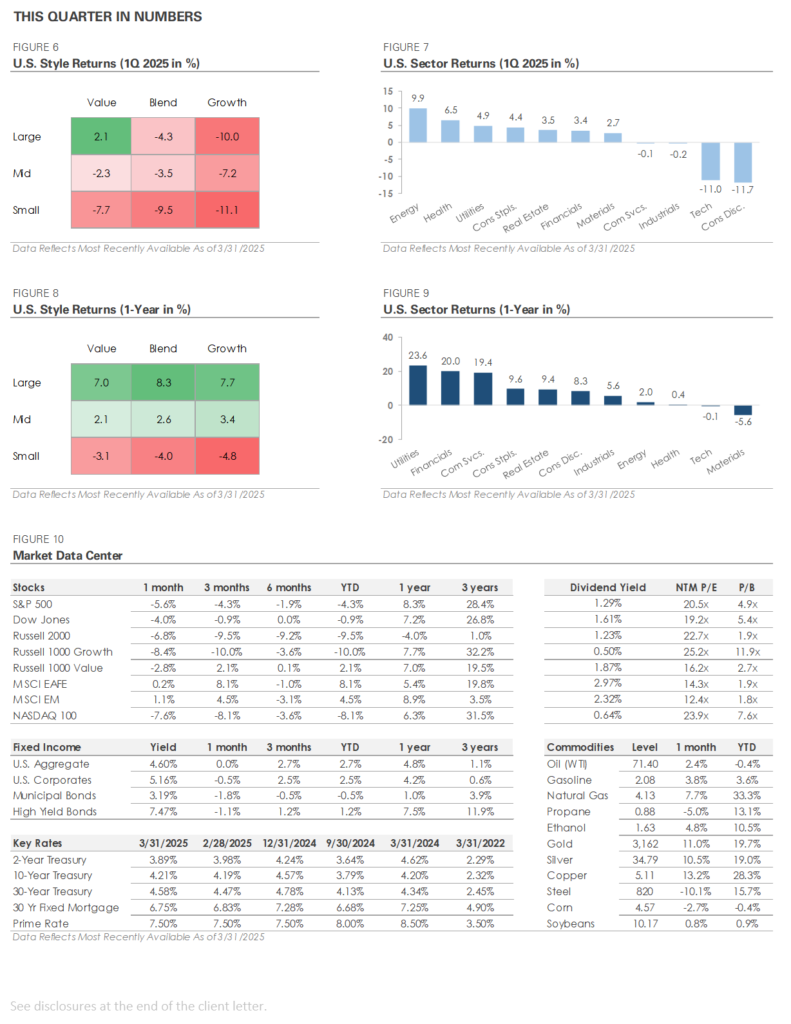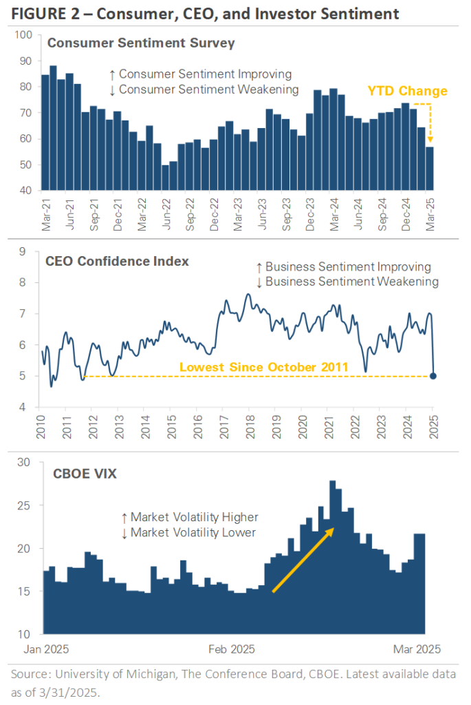 The bottom chart graphs market volatility during the first quarter, as measured by the CBOE Volatility Index (VIX). Volatility increased in early 2025, starting in mid-February. Some market volatility is normal, but the recent spike occurred as policy uncertainty increased and the stock market sold off. Markets dislike uncertainty, and until there is more clarity, market volatility could remain elevated.