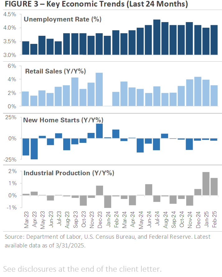 It is important to remember that the stock market isn’t the economy. In other words, the performance of the stock market doesn’t always reflect real-time economic conditions. This is because the market is forward-looking and prices in expectations for what’s to come. The previous section highlighted how rising policy uncertainty affected sentiment in Q1, and this section examines the latest economic data. Figure 3 on the next page graphs four economic indicators that offer insight into the state of the U.S. economy: the unemployment rate, retail sales, housing starts, and industrial production.