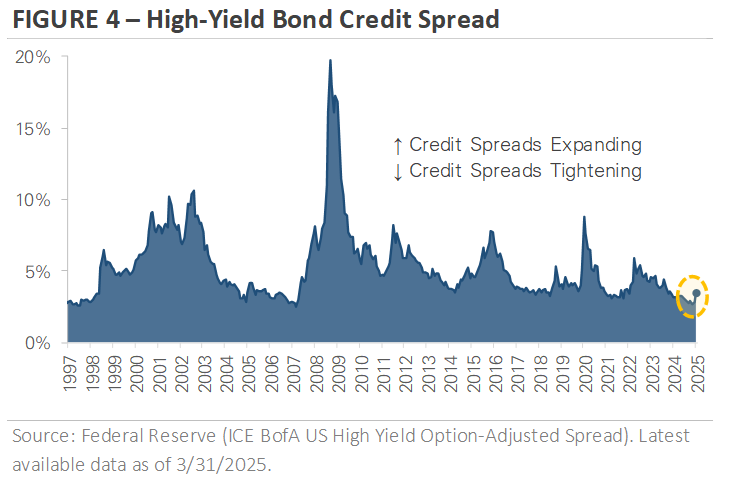 Figure 4 graphs the high-yield credit spread since 1997. The high-yield spread narrowed in late 2024 as the Federal Reserve cut interest rates, reaching levels last seen in 2007. However, the yellow circle shows credit spreads widened in Q1. The increase indicates investors are becoming more cautious, with the potential for tariffs and slower economic growth leading to higher credit risk.