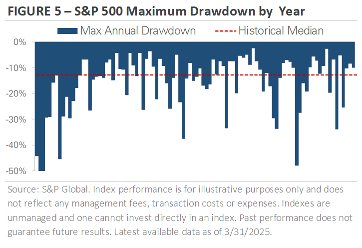 Figure 5 puts the Q1 market volatility and selloff into perspective. It uses almost a century of S&P 500 price data to show that market pullbacks like this year are not just common—they’re a healthy and recurring part of investing. The chart graphs annual drawdowns, or the largest peak-to-trough decline within each calendar year. The bars show the S&P 500 experiences a pullback nearly every year, with a median intra-year drawdown of -13%. Since 1928, the S&P 500 has experienced a drawdown of -5% or more in 91 out of 98 calendar years, including 2025.